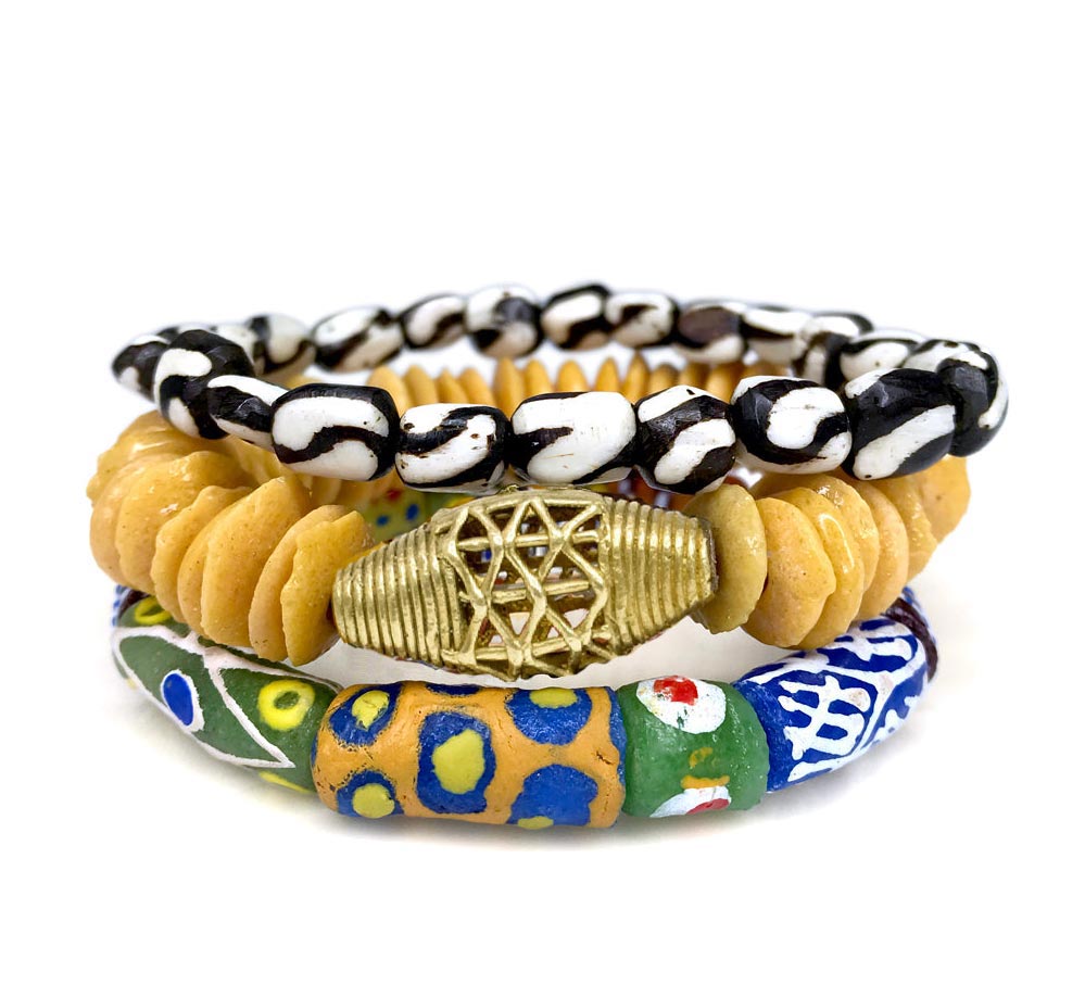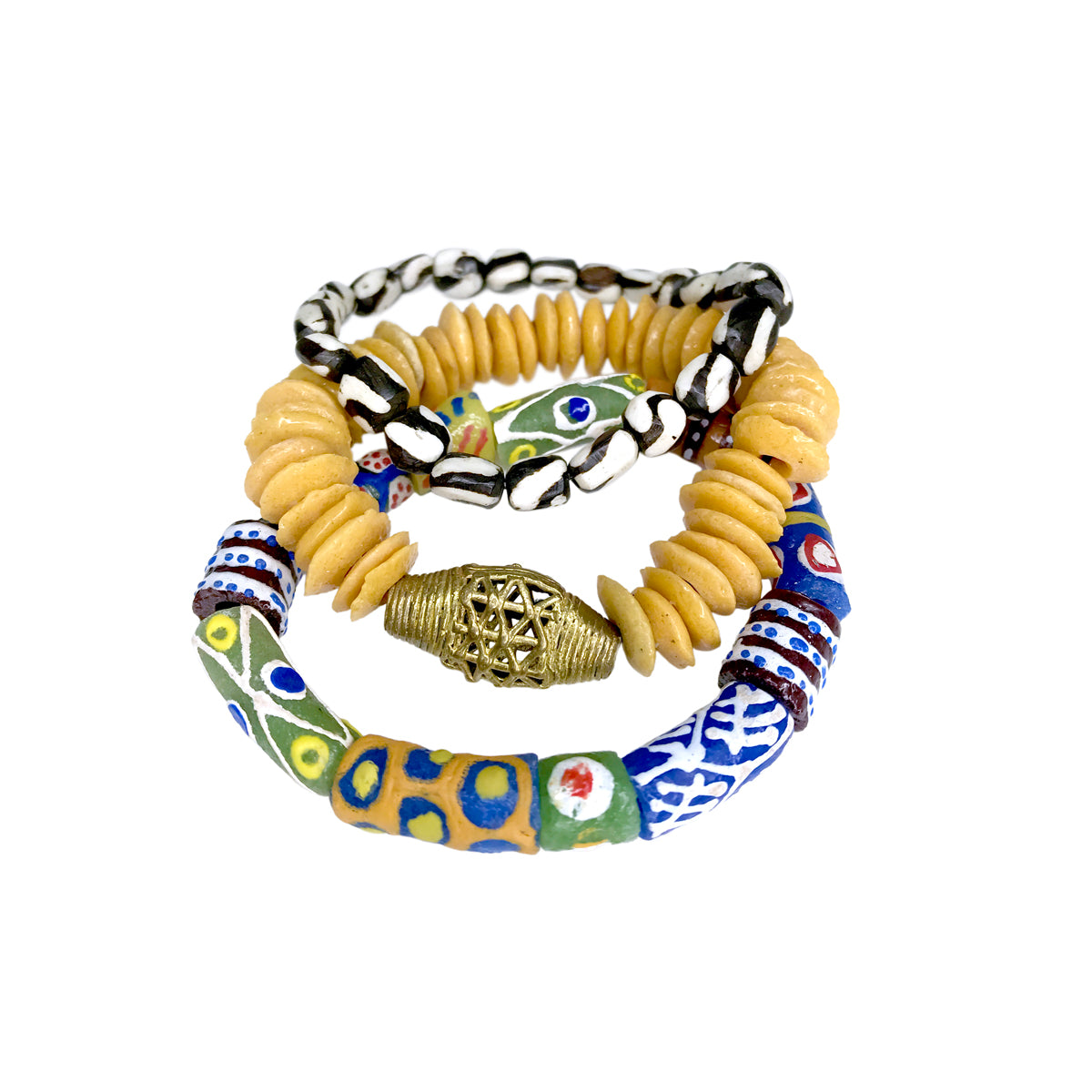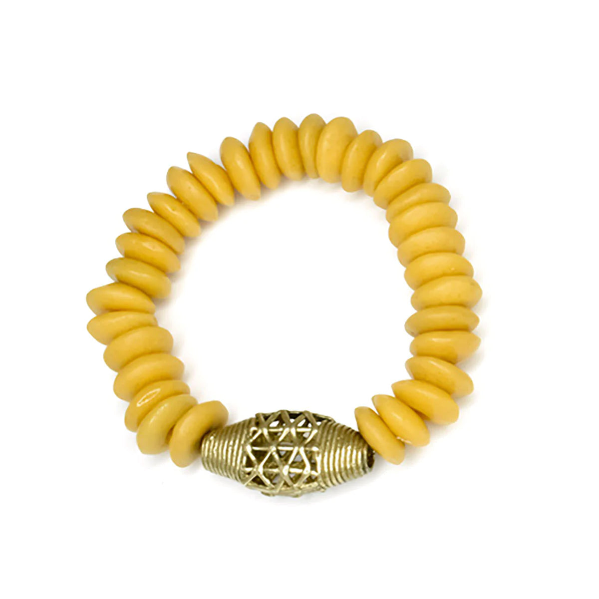 Yellow Krobo Glass Bead Bracelet Brass Bead Centerpiece Bracelet | Batik Bone Bead bracelet | - SET