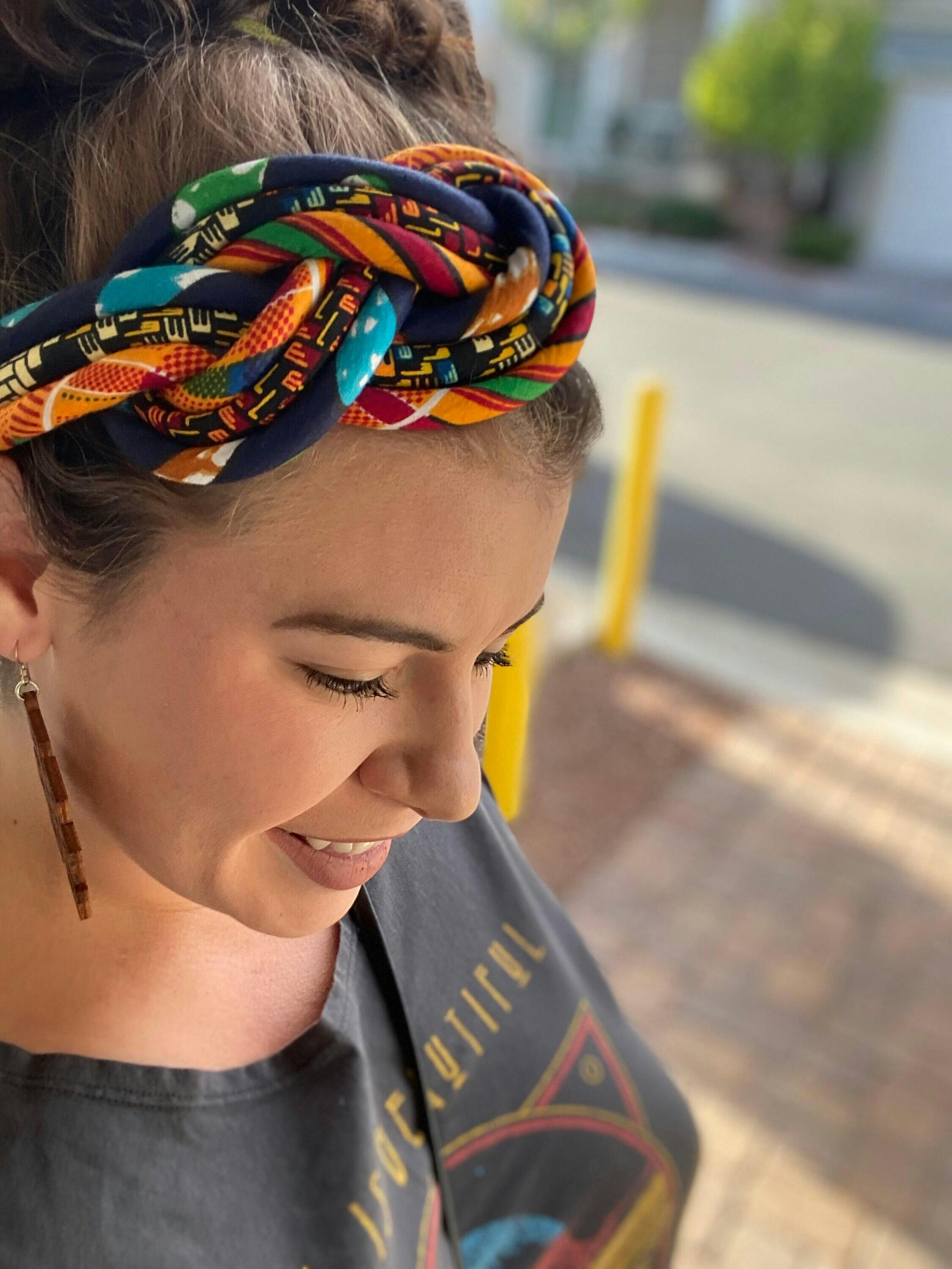 The Knotted Sunrise Kente Headband is a vibrant fusion of tradition and vitality. Made from authentic African wax prints in warm oranges, deep navy, lush green, and bold red, this 3-strand braided headband features a symbolic front knot — representing unity and strength in African design.