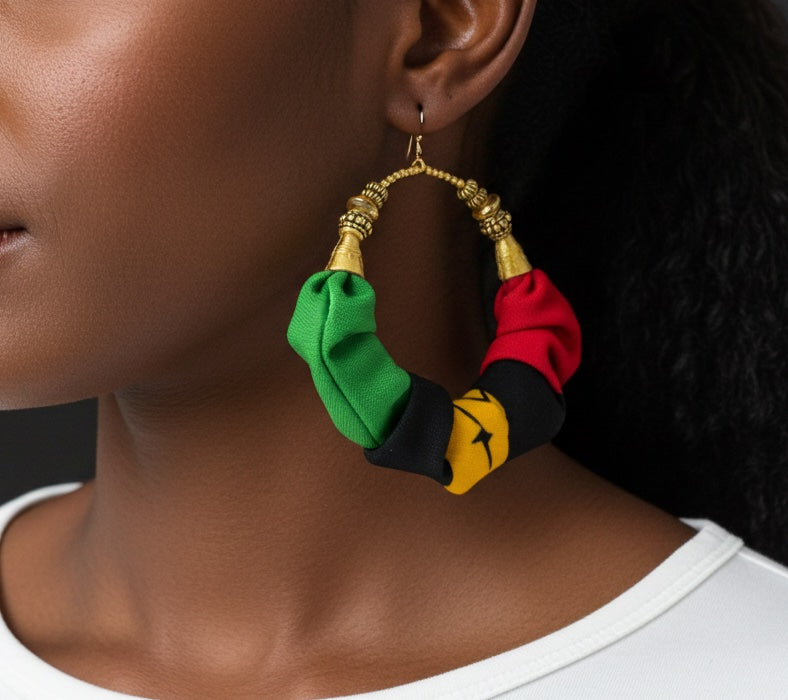 These bold Pan-African Power Hoops are more than earrings—they’re a declaration. Featuring scrunched red, black, and green fabric with a vibrant yellow accent, this design pays tribute to unity, liberation, and the enduring strength of the African diaspora.