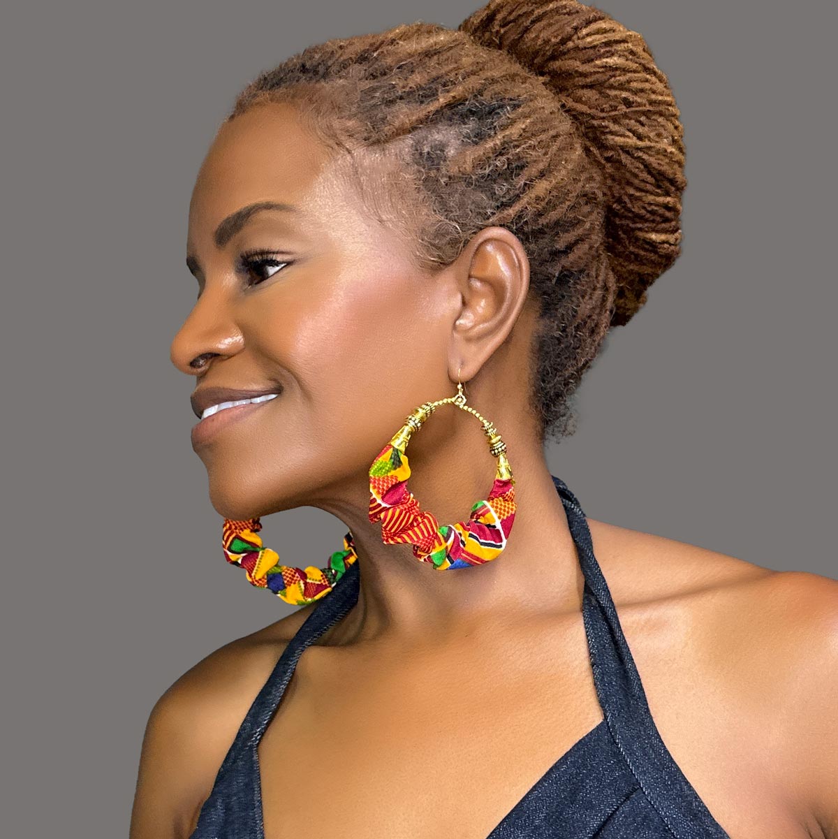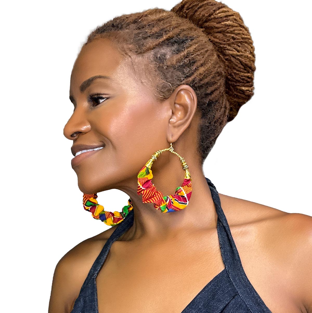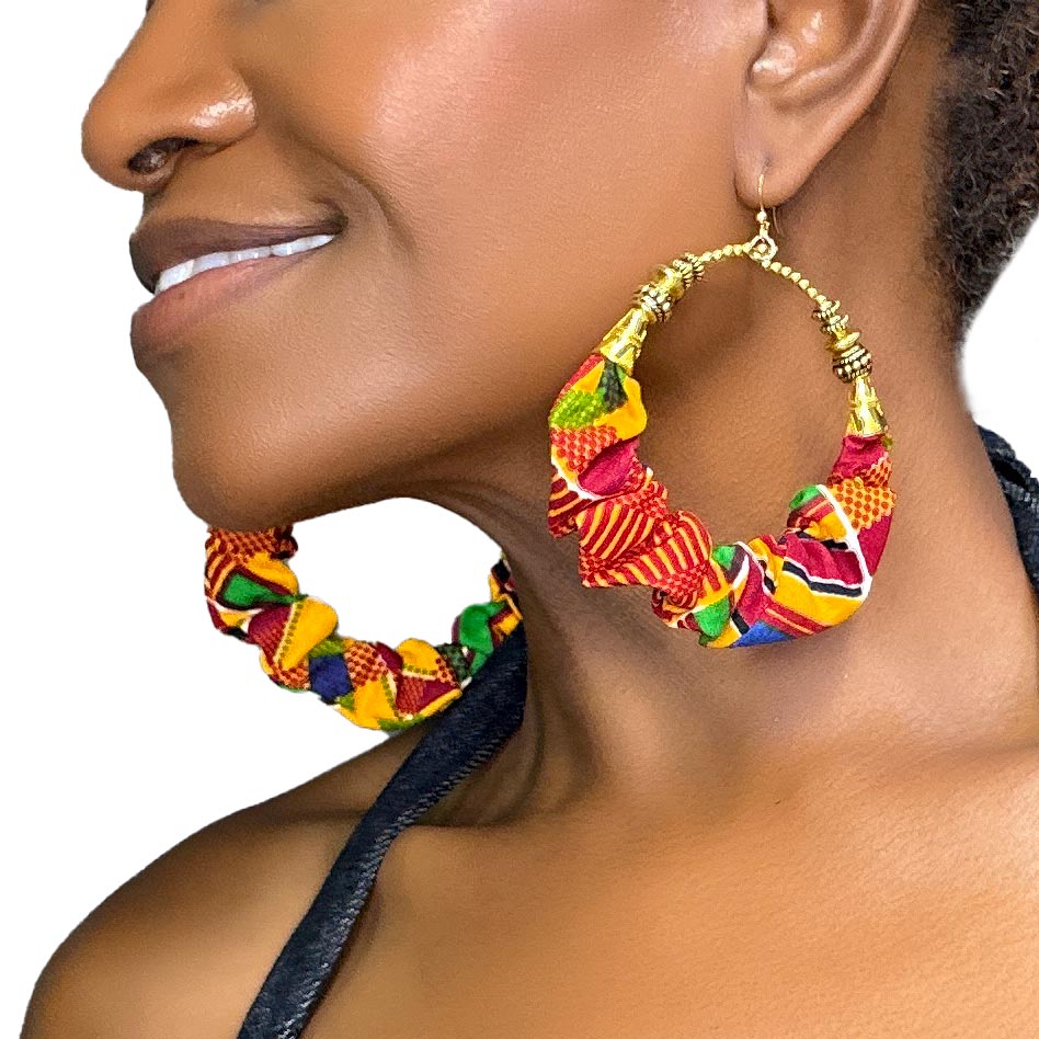 Let your roots shine with the Kente Sunburst Hoops, a powerful burst of color and pride. These hoops feature vibrant scrunched fabric in a bold mix of reds, oranges, yellows, greens, and purples — drawing inspiration from traditional Kente cloth, a textile long associated with royalty, dignity, and heritage across West Africa.