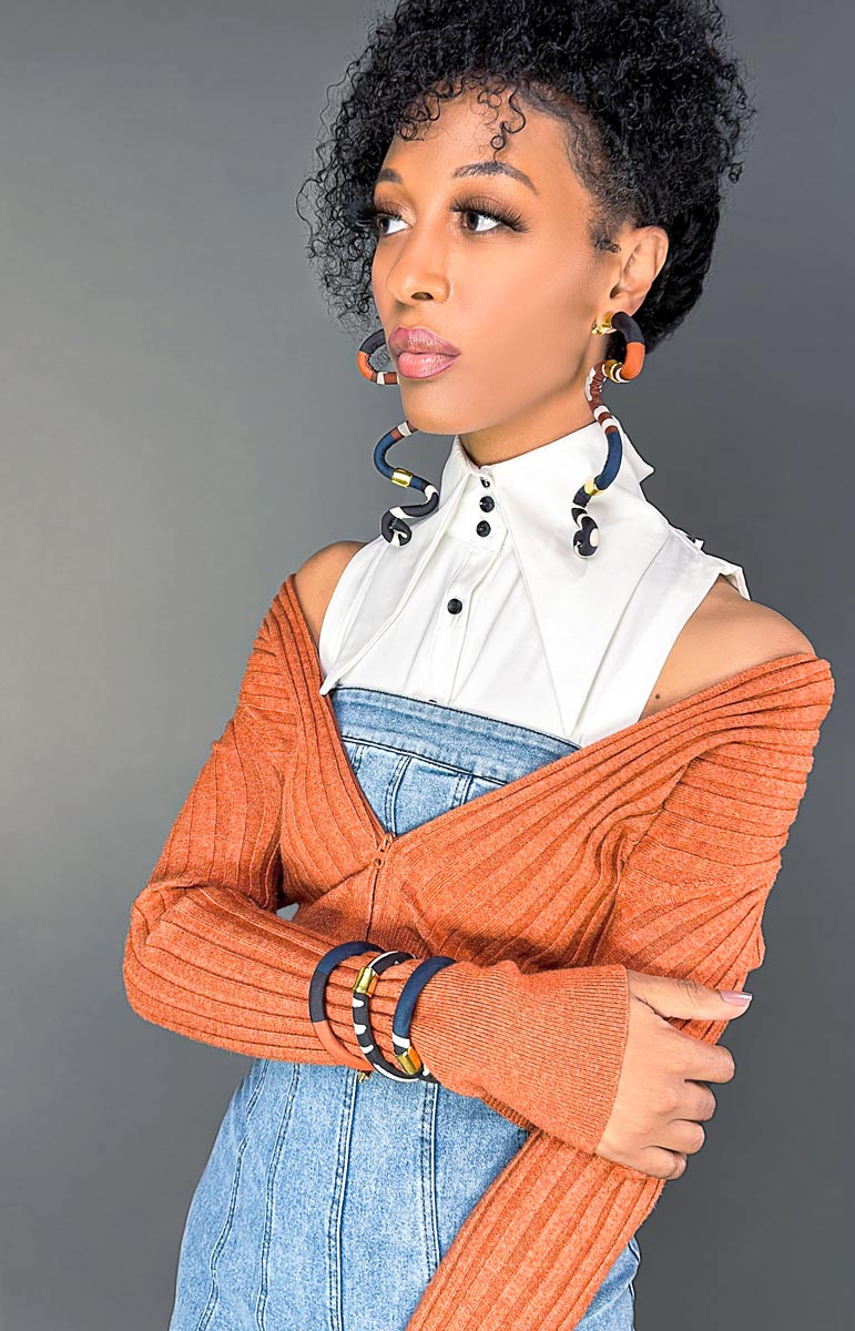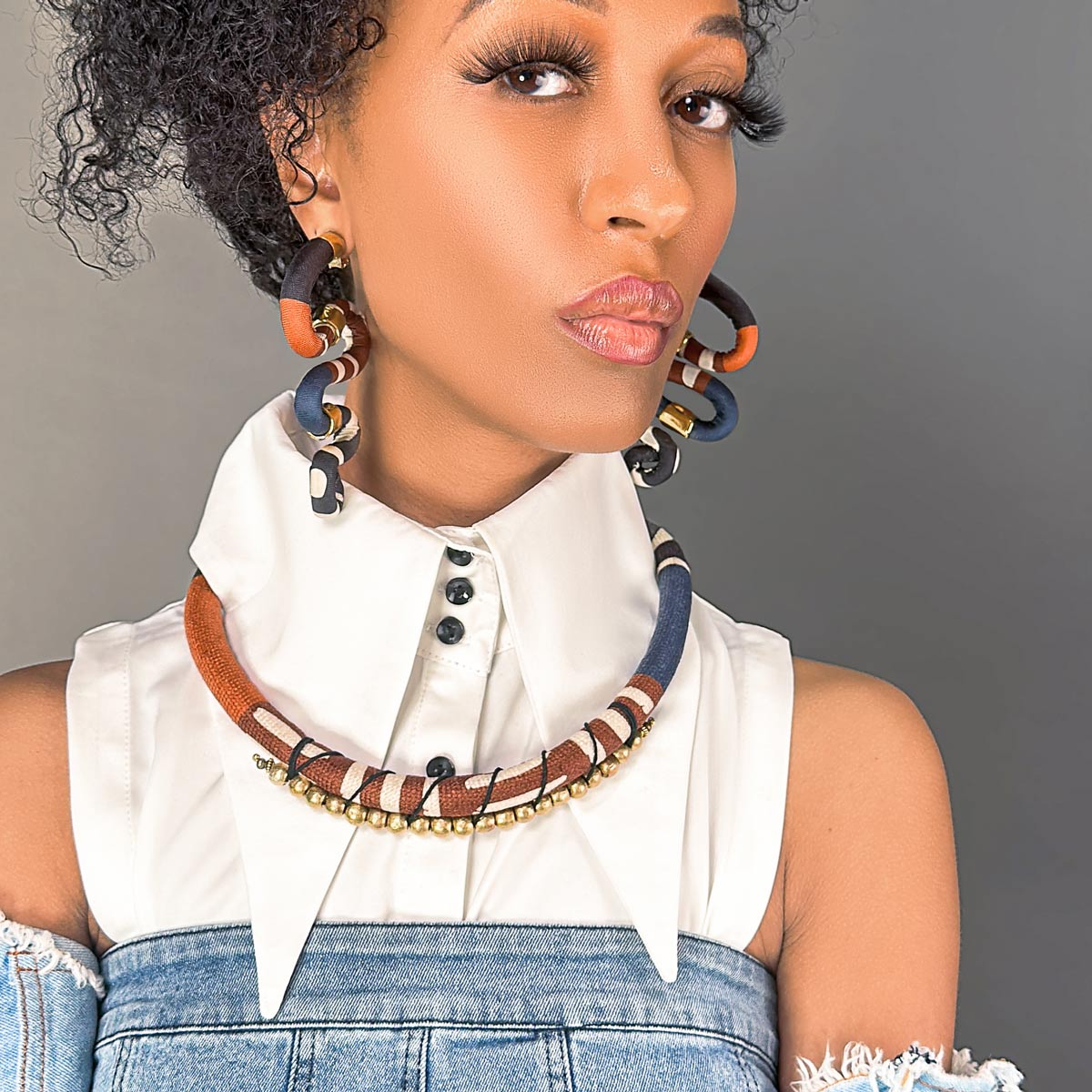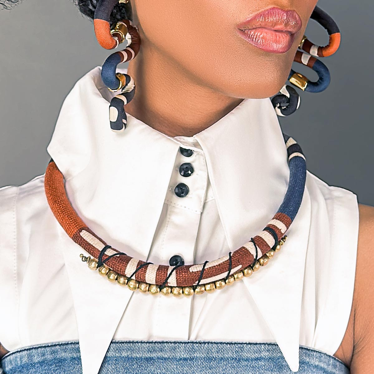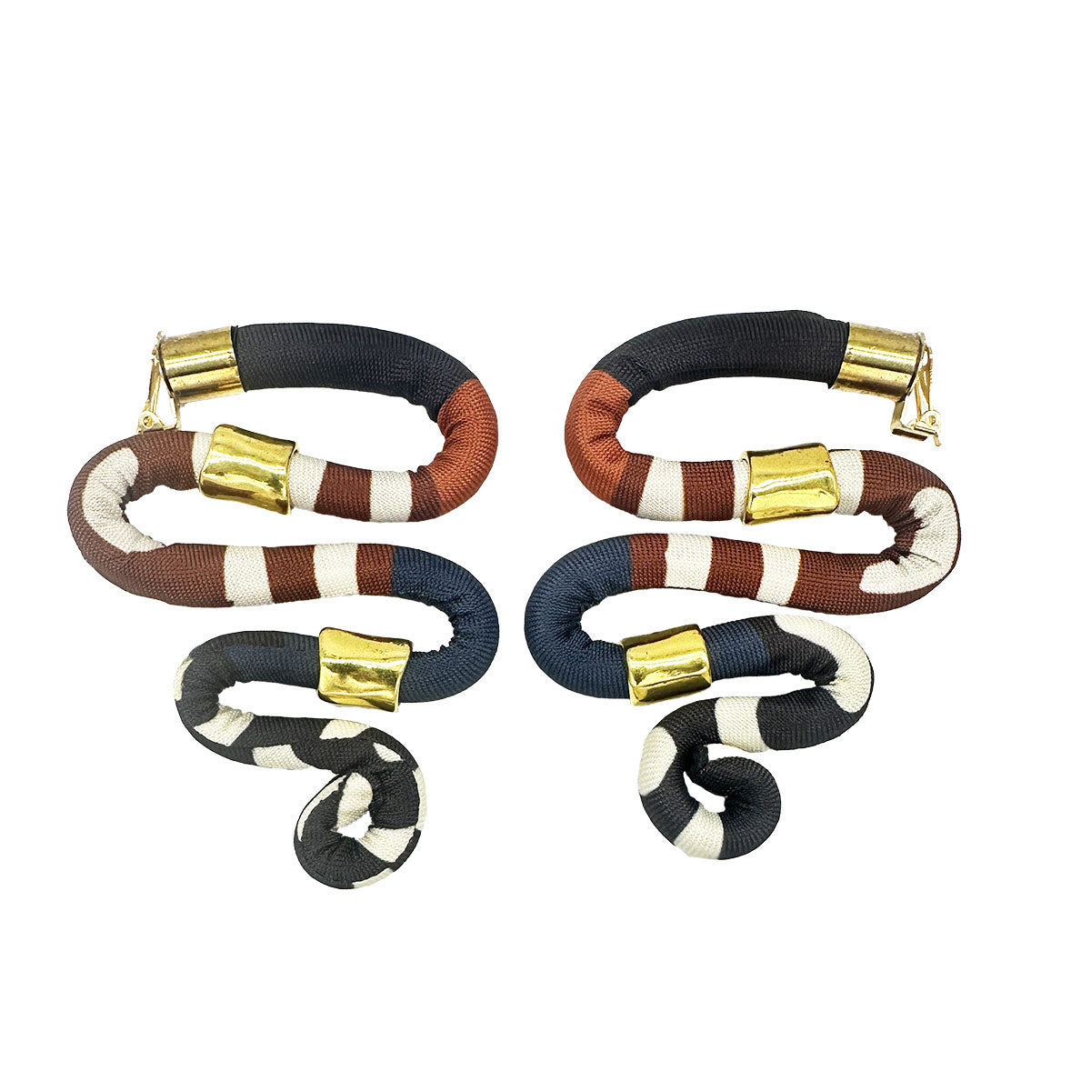 Burnt Orange Brown and Evening Blue Mali Print Earring. This earring is bendable, create your own new shape!