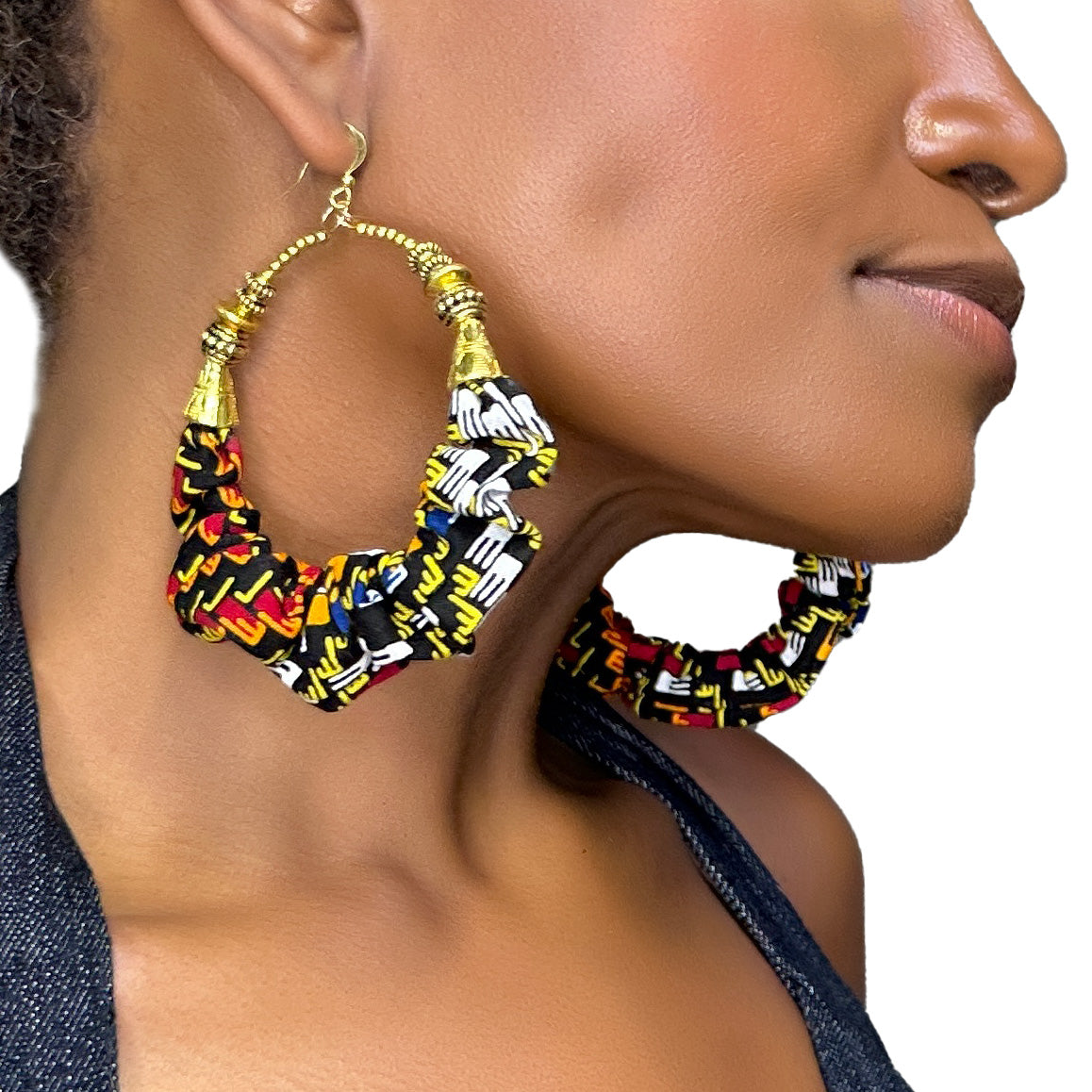 These African-inspired Ketepa Hoop Earrings radiate vibrant energy and Afrocentric pride. Each pair features colorful African wax print fabric that’s carefully sewn and scrunched around a gold-tone hoop, creating a rich, textured statement piece.