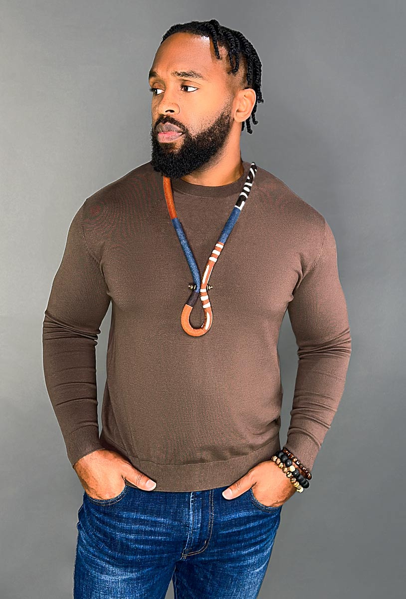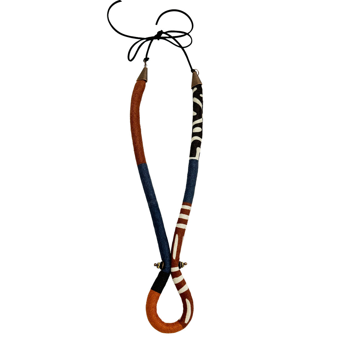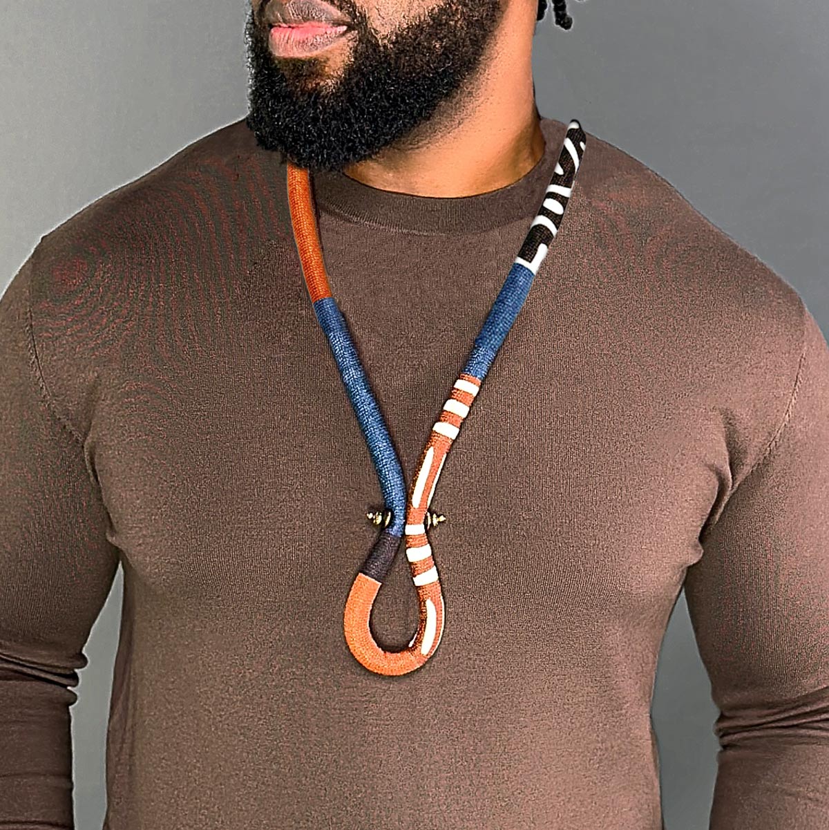 Men's Burnt Orange, Brown, Evening Navy Blue African Pattern Tie and Solid Print Mixed Cord Tie Necklace | Evening Blue African Print Necklace