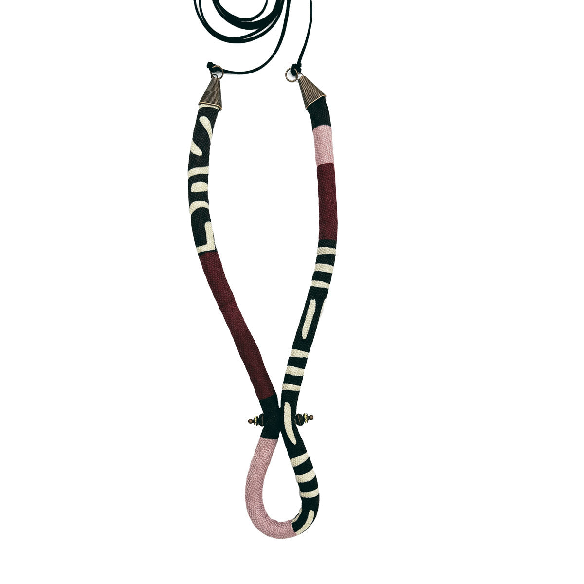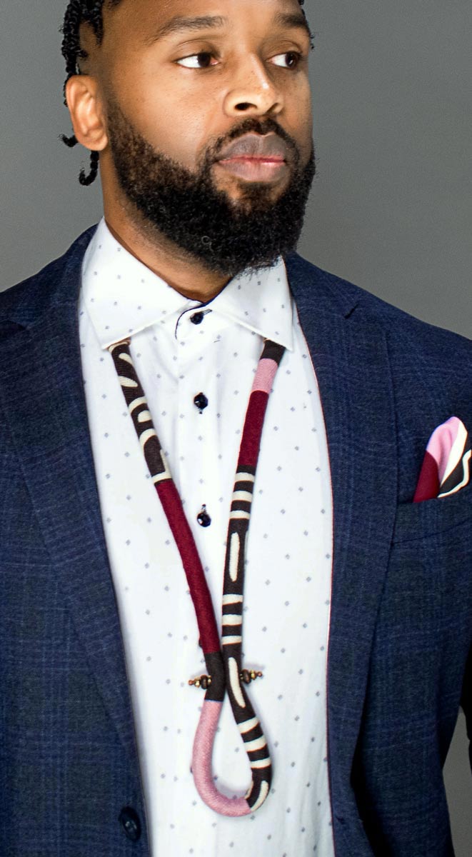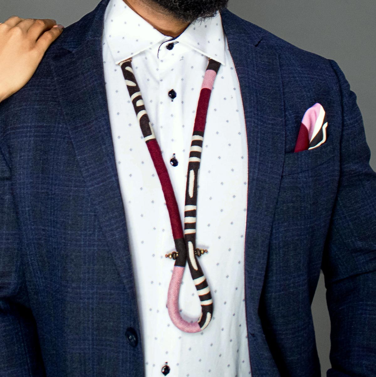 Maroon Pink Plum African and Solid Print Mixed Cord Tie Necklace | Mens African Print Necklace
