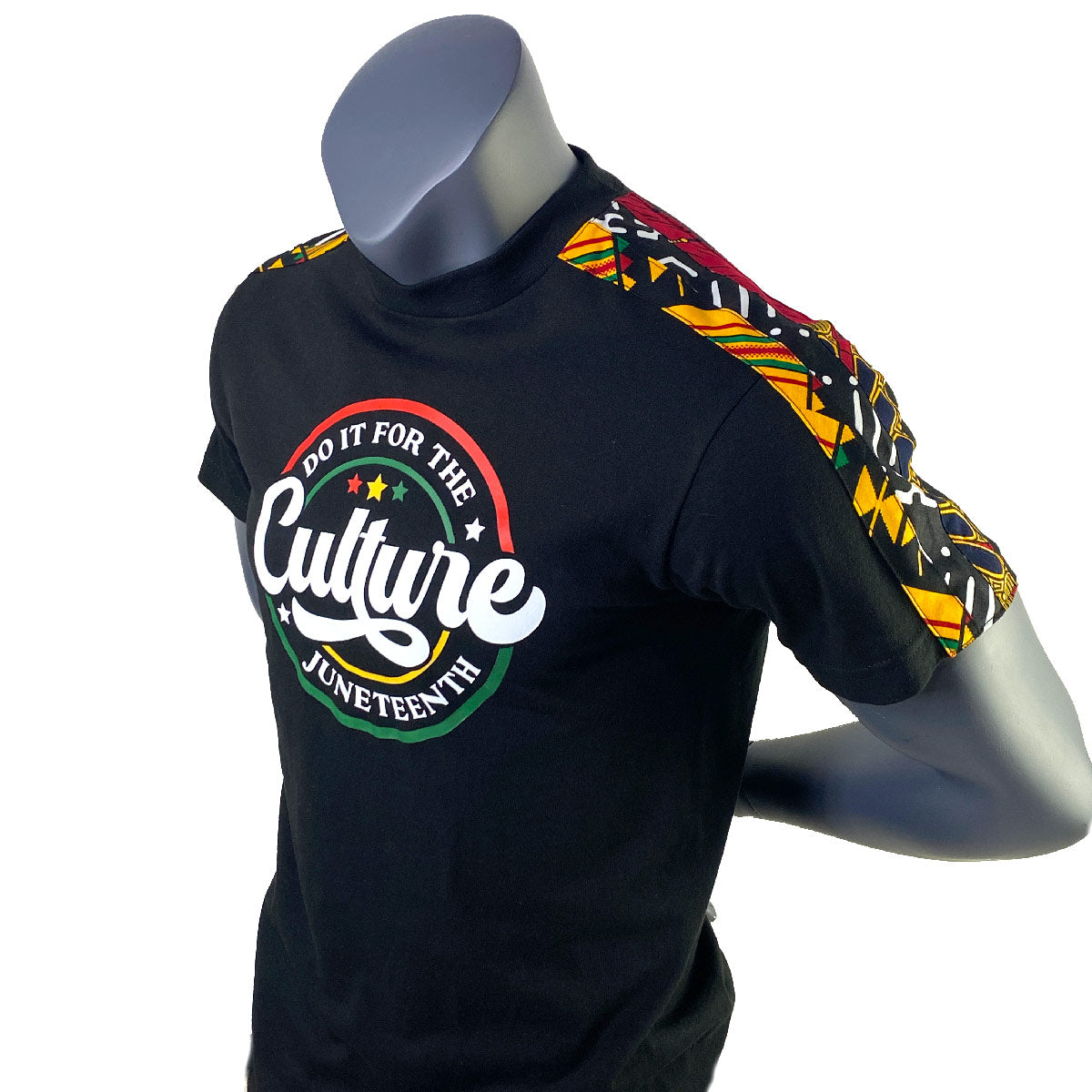 Juneteenth Unisex Black African Print Shirt | Yellow, Black & Red Shoulder Print Detail | Juneteenth | Shoulder Print | African | Unisex Shirt | Cloth & Cord