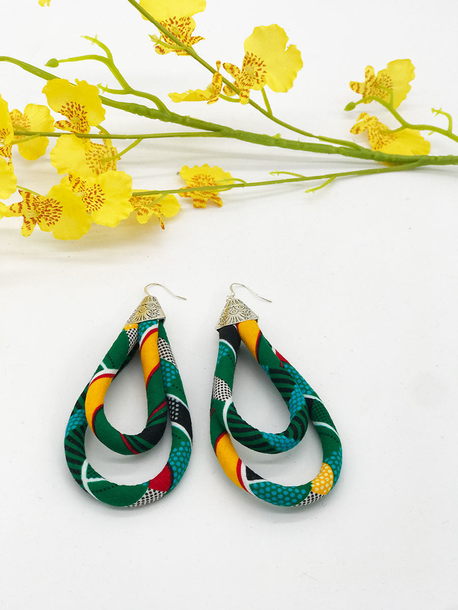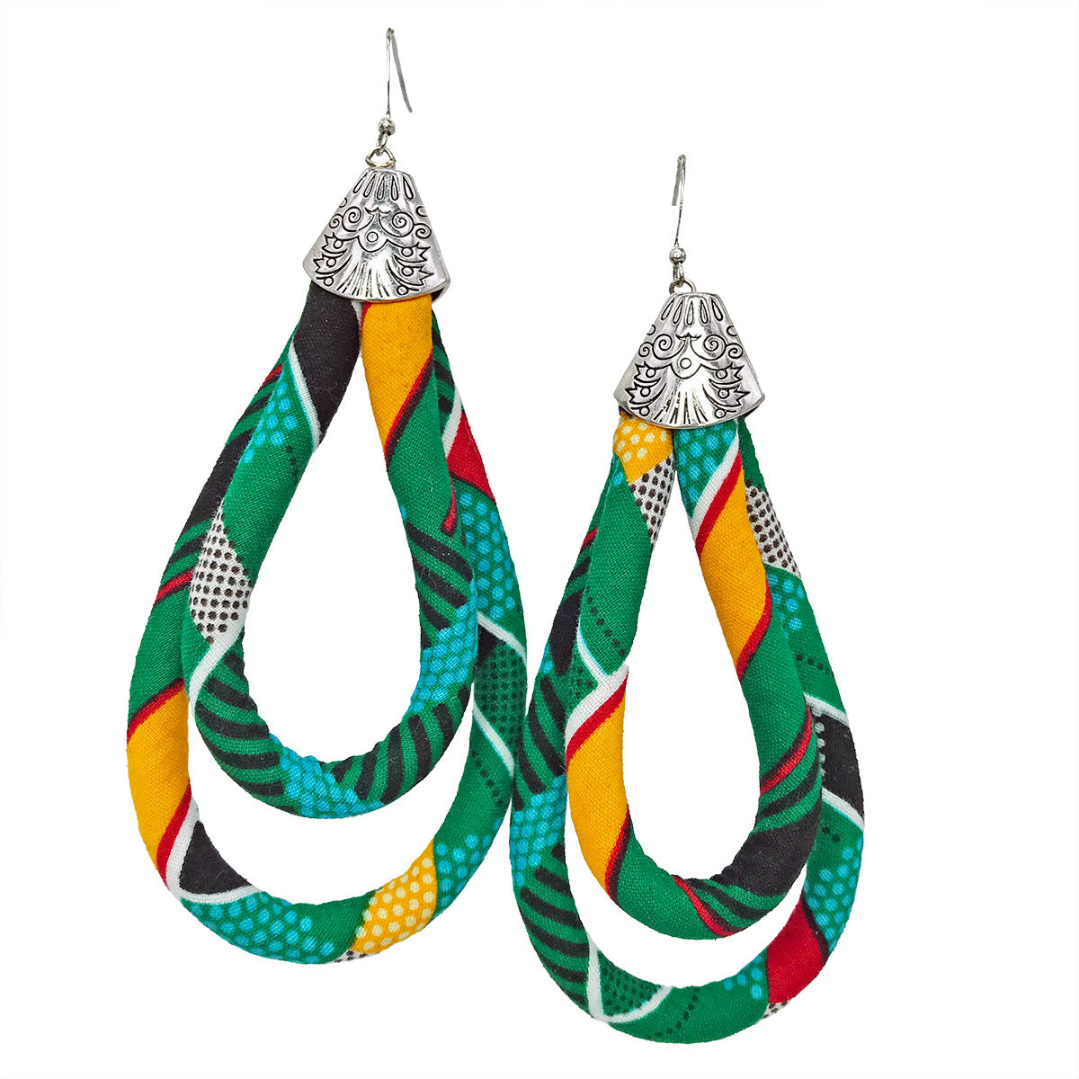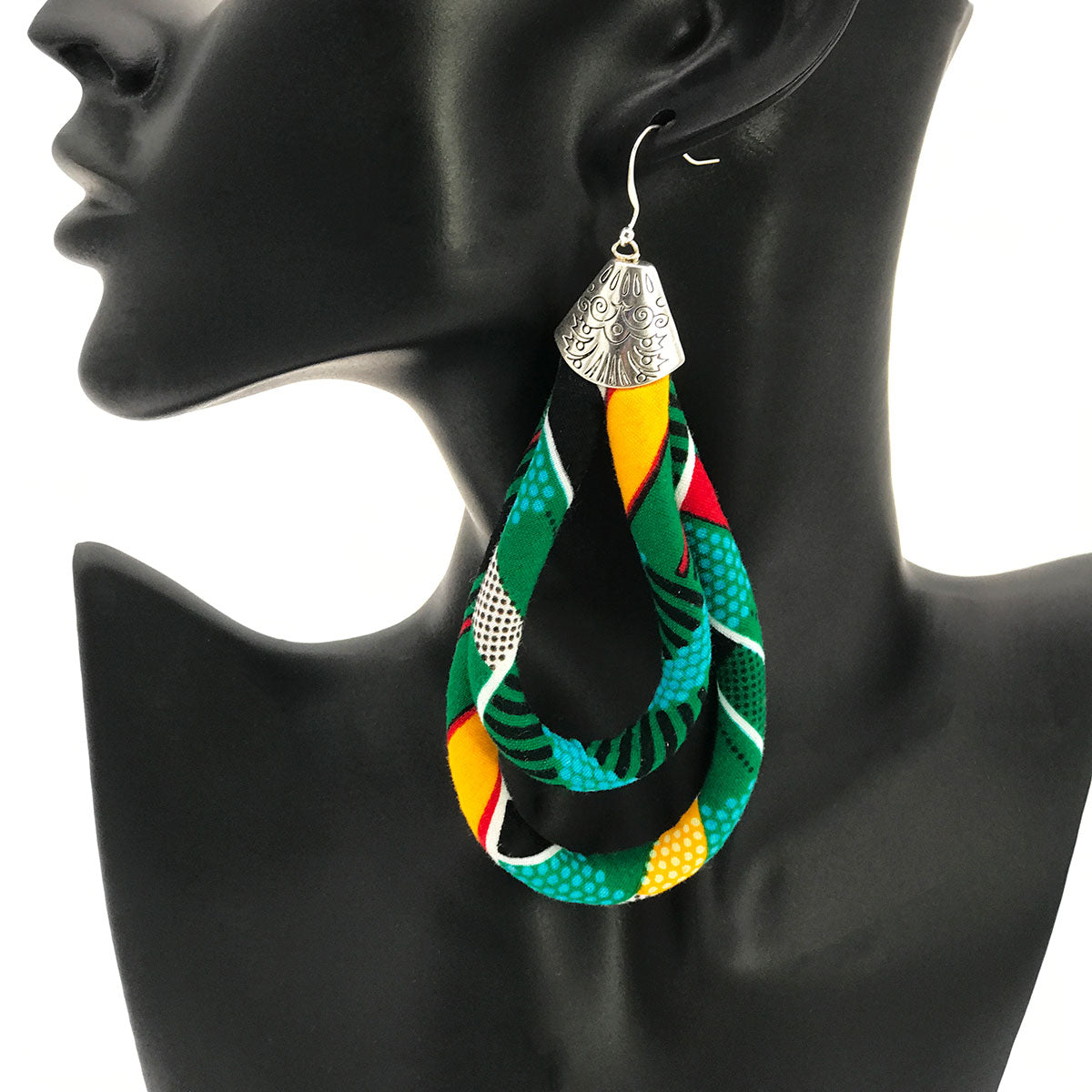 Boucles d'oreilles en tissu africain turquoise | Boucles d'oreilles turquoise, rouge, blanc, noir, vert et jaune | Grandes boucles d'oreilles en tissu africain | Tissu et cordon