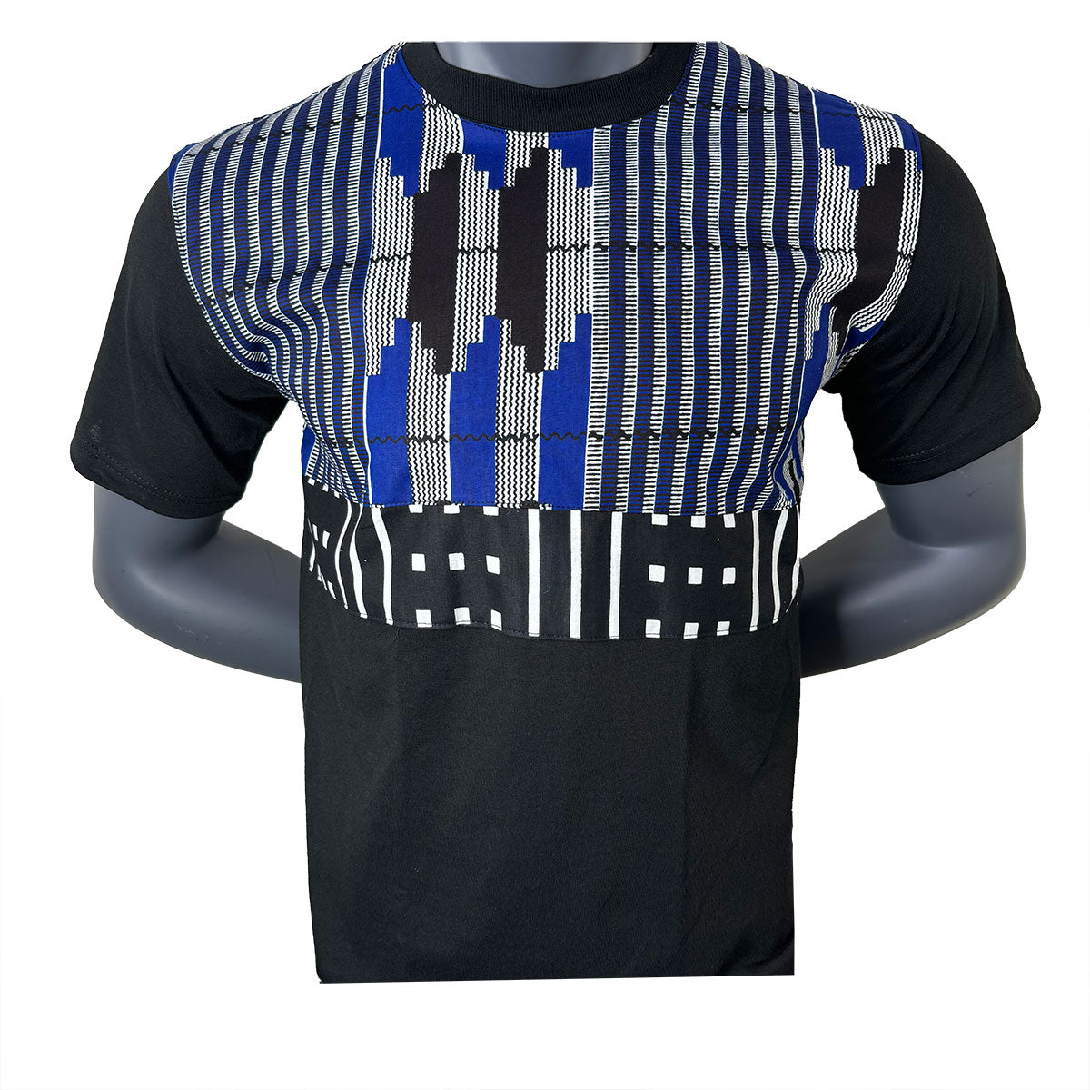 T-shirt unisexe décontracté à manches courtes pour homme, avec imprimé africain appliqué à plusieurs niveaux bleu, blanc et noir. Fabriqué à la main en interne avec du coton wax africain. Ce t-shirt C'est une excellente option pour une tenue décontractée et originale. Associez-la à un jean ou glissez-la dans un pantalon habillé avec vos chaussures décontractées préférées.
