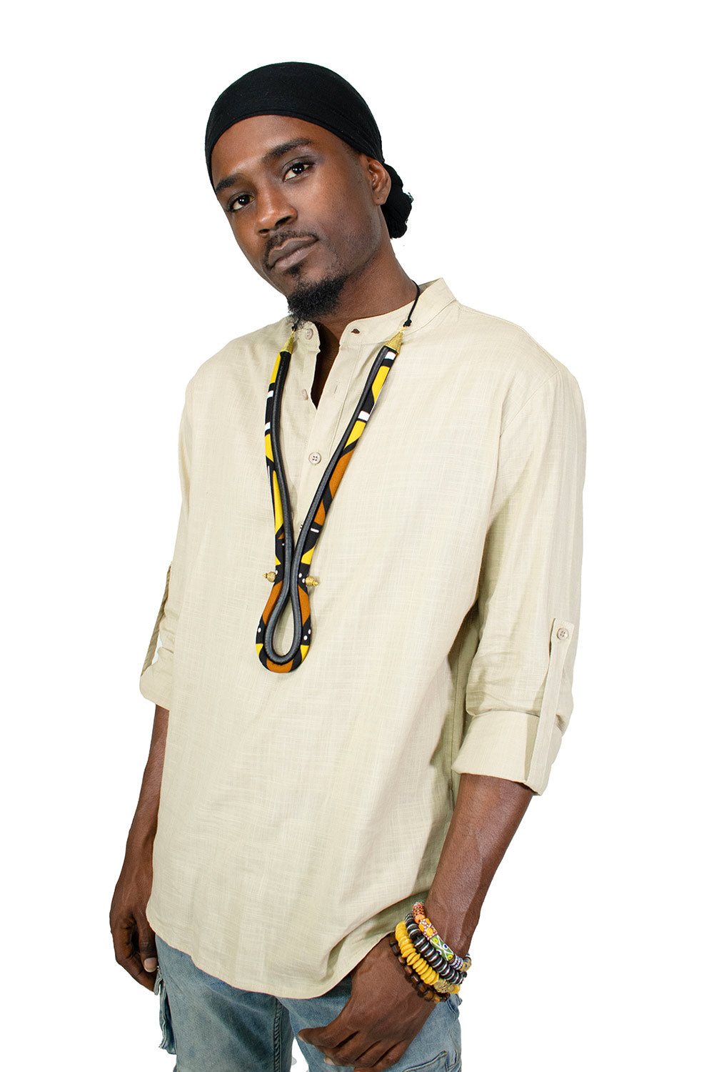 This African Mudcloth Print & Leather Y Necklace is a unique and stylish accessory for both men and women.