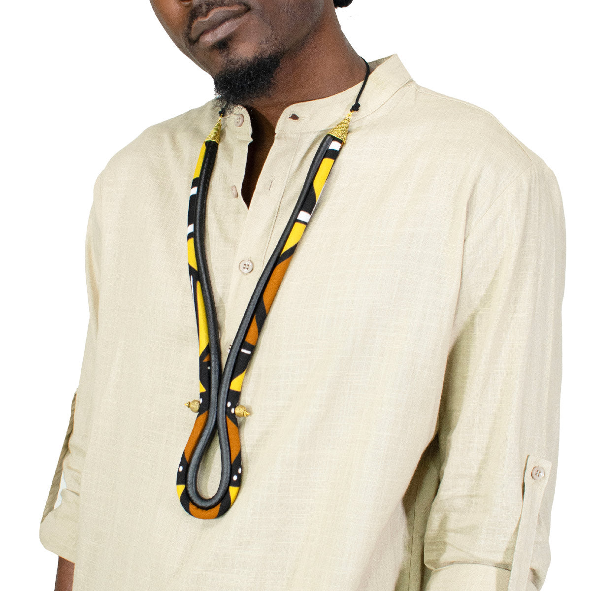 African Mudcloth Print & Leather Y Necklace | Brown, Yellow, Gold, Black & White Men's Tie | Ladies Necklace | Unisex Collar | Cloth & Cord